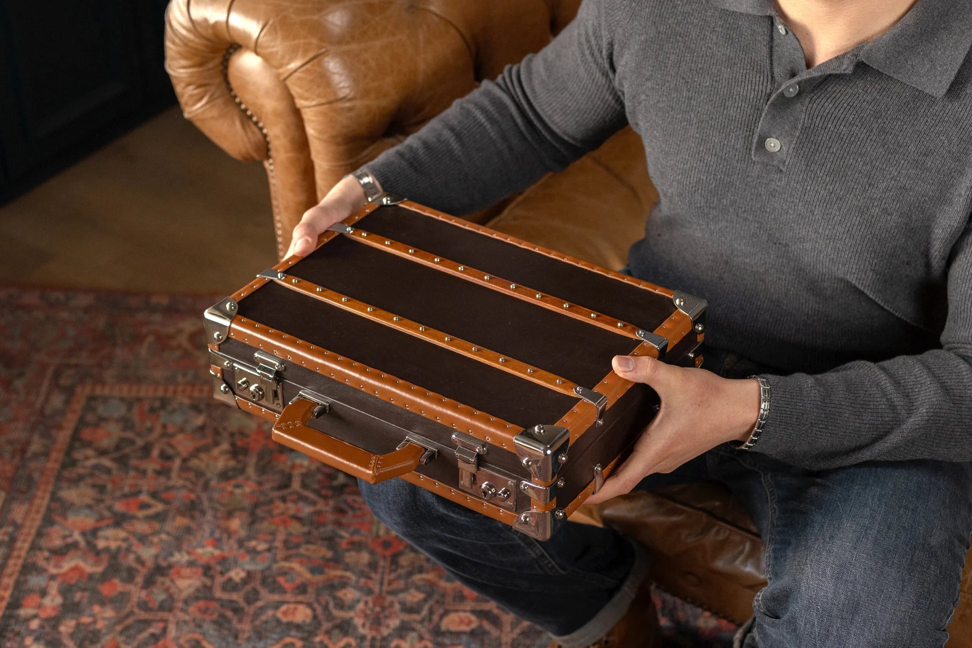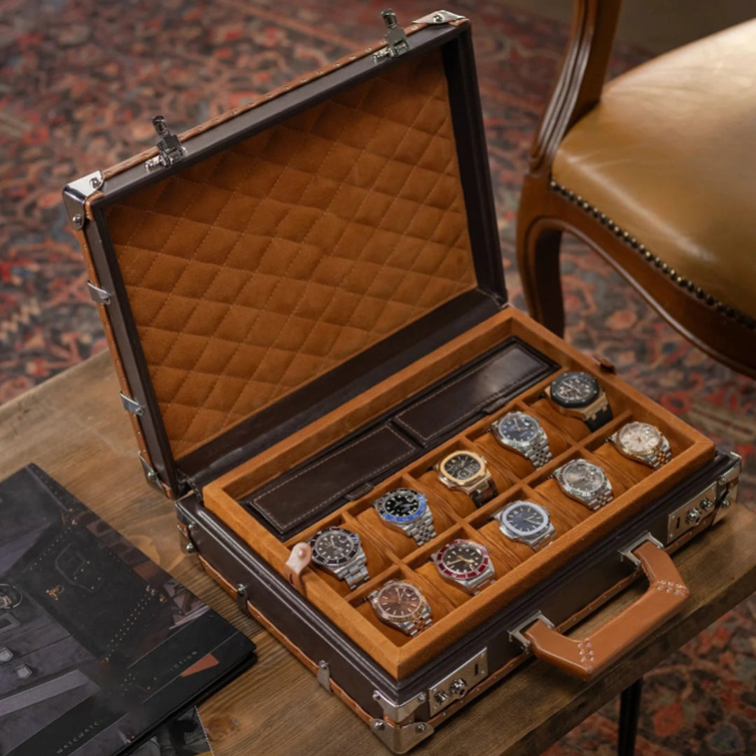 この時計ケースは、100%フルグレインレザーの高品質レザーを使用しています。外側には天然皮革、内側には天然スエードレザーを使用しています。すべてのクッションには天然スエードを使用。工業用スエードは使用していないため、レザーウォッチコレクターケースならではの自然なベルベットのような質感をお楽しみいただけます。スエードと時計の相性は抜群で、まさにシックな仕上がりです。