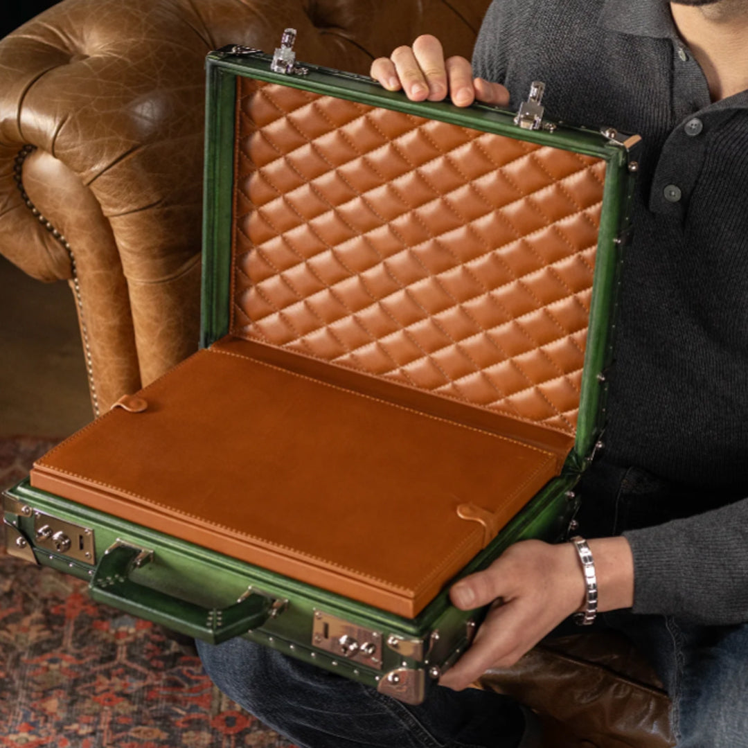 時計ケースを閉じる際、上部のシャッターの内側は時計に触れません。傷がつかないよう隙間を設けています。また、職人がケースの革と骨組みの間に特殊なパッドを施し、衝撃を防止します。時計を保管する際は、トレイ(インサート)を取り外すことができます。