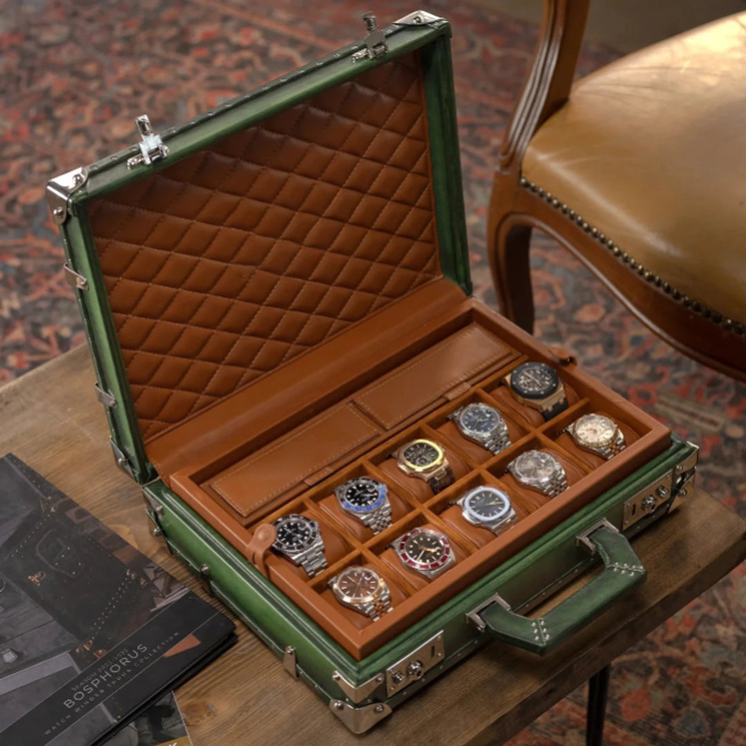 内装のカラーとポケットはお好みに合わせてカスタマイズ可能です。ポケットを取り外してケースを回転させると、15本の時計を収納できます。ポケットは、予備のベルト、バネ棒、ピンなどを収納するなど、ケースを最大限に活用できます。