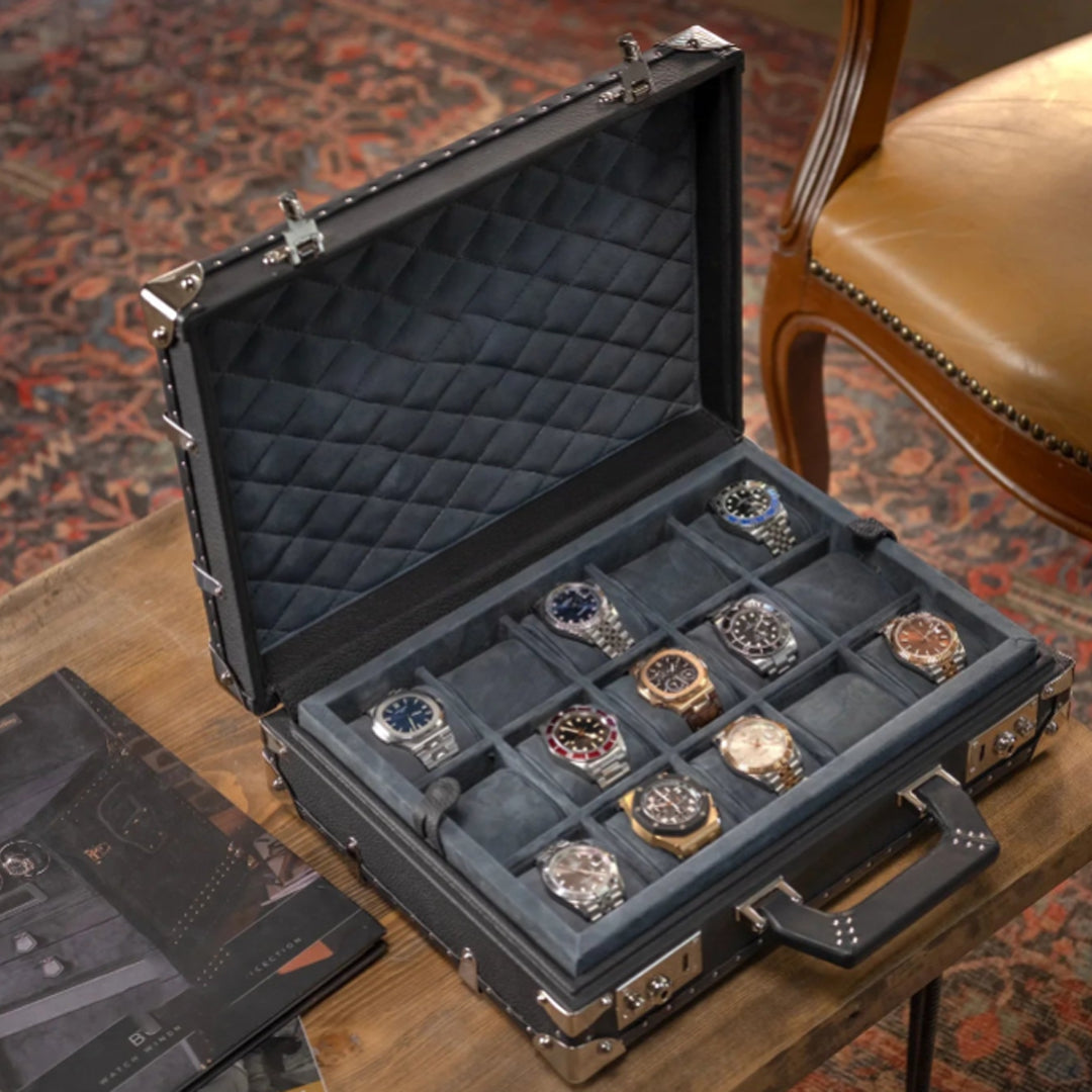 内装のカラーとポケットはお好みに合わせてカスタマイズ可能です。ポケットを取り外してケースを回転させると、15本の時計を収納できます。ポケットは、予備のベルト、バネ棒、ピンなどを収納するなど、ケースを最大限に活用できます。