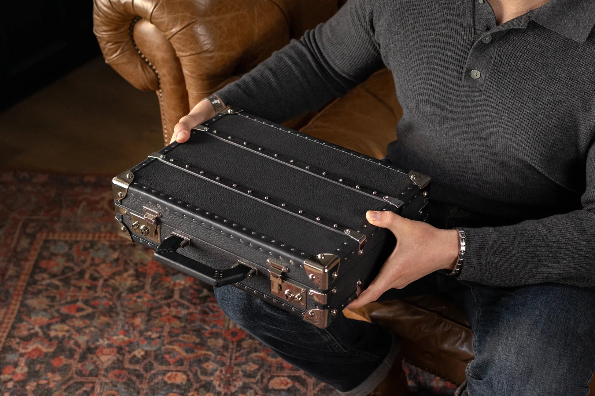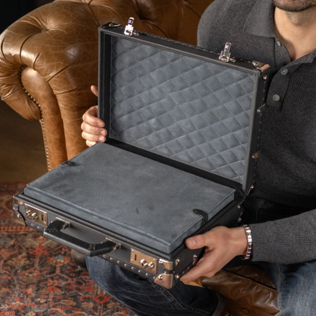 時計ケースを閉じる際、上部のシャッターの内側は時計に触れません。傷がつかないよう隙間を設けています。また、職人がケースの革と骨組みの間に特殊なパッドを施し、衝撃を防止します。時計を保管する際は、トレイ(インサート)を取り外すことができます。